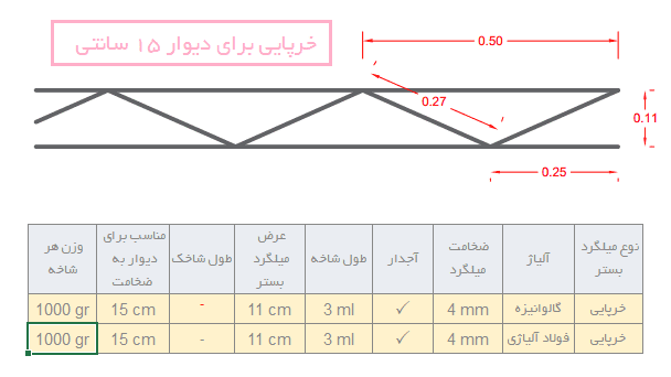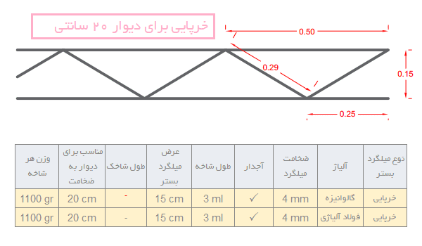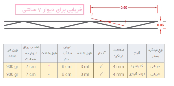 عموما در ابعادی به طول ۳ متر از میلگرد آجدار گالوانیزه قطر ۴میلی‌متر به شکل نردبانی، خرپایی و مشبک در عرض های 6 ، 11 و 15 سانتیمتر  تولید می‌نمایند. خرید آن بصورت کیلویی می باشد.