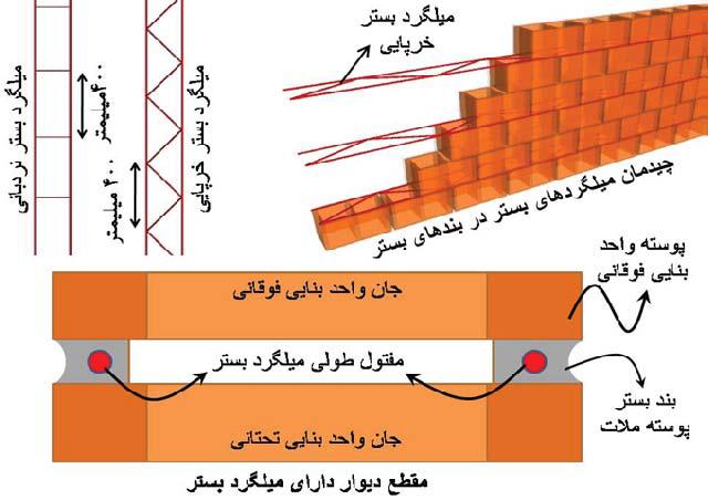 • میلگرد بستر بایستی به طور کامل در داخل ملات بستر قرار گیرد تا از طریق ملات، پیوستگی بین واحد بنایی و میلگرد بستر فراهم شود. ضخامت ملات باید حداکثر 16 میلیمتر باشد.