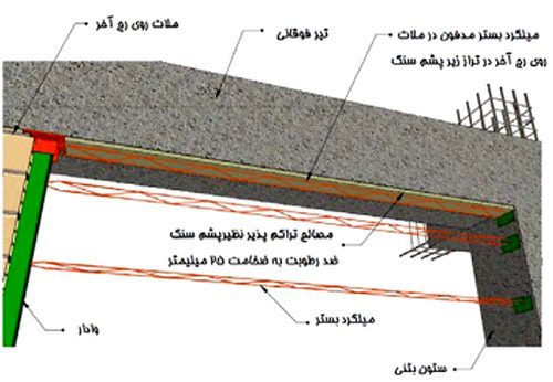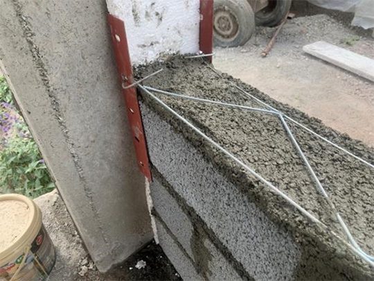 4. هنگام دیوارچینی به اندازه ۲۰ سانتی‌متر انتهای میلگرد بستر ۹۰ درجه خم شده و درون بست قرار می‌گیرد. در نهایت حداقل ۱.۵ سانتی‌متر ملات روی میلگردهای بستر اجرا می‌شود.