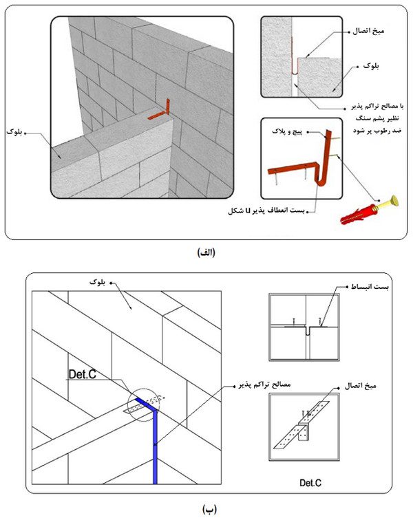 در ابتدا بایستی روی دیوار اصلی محل دقیق قرارگیری بست‌های ارتجاعی تعیین شوند تا به هنگام اجرای دیوار متقاطع، به مشکل نخوریم. همچنین فاصله تعیین شده برای اجازه حرکت دیوار متقاطع بایستی با استفاده از مصالح تراکم‌پذیر فراهم شود. بست‌های ارتجاعی به دو نوع بست‌های رادیکالی و انبساطی تقسیم می‌شوند که در شکل زیر دیتیل‌های آن‌ها را مشاهده می‌کنیم.