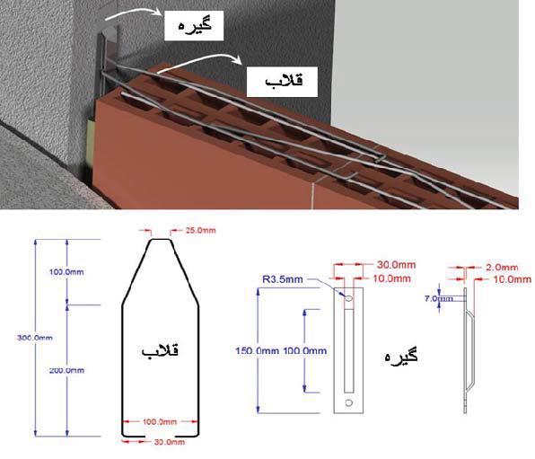 از جنس فولاد گالوانیزه و دارای قطر 4 میلی‌متر و طول 30 سانتی‎‌متر می باشد همچنین عرض قلاب باید به اندازه عرض دیوار منهای 3 سانتی‌متر باشد. میلگرد بستر با سیم به قلاب متصل می‌شود.این قلاب‌ها پس از عبور از میان گیره در بین سطوح دیوار و ملات مدفون می‌شود و نیازی به اتصال جوشی با میلگرد بستر ندارد.