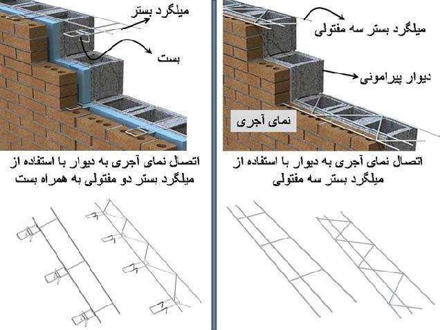 • در نماهای آجری، نما باید در ترازی که دیوار خارجی مسلح شده است با بست به دیوار پشت مهار شود. در همان تراز باید یک عدد میلگرد در لایه نما نیز قرار داده شود. (این میلگرد به کمک بست ها به میلگرد بستر درون دیوار متصل می شود)  یا از میلگرد بستر سه تایی استفاده کنیم ، به صورتی که یک ردیف از میلگردها درون نما قرار گیرد.