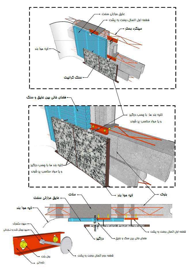 • در نماهای سنگی نیز با اجرای بست در شکاف سنگ می توان آن را به نحو مناسبی به دیوار خارجی ساختمان متصل نمود. یا از میلگرد بستر سه تایی استفاده کنیم ، به صورتی که یک ردیف از میلگردها درون نما قرار گیرد.