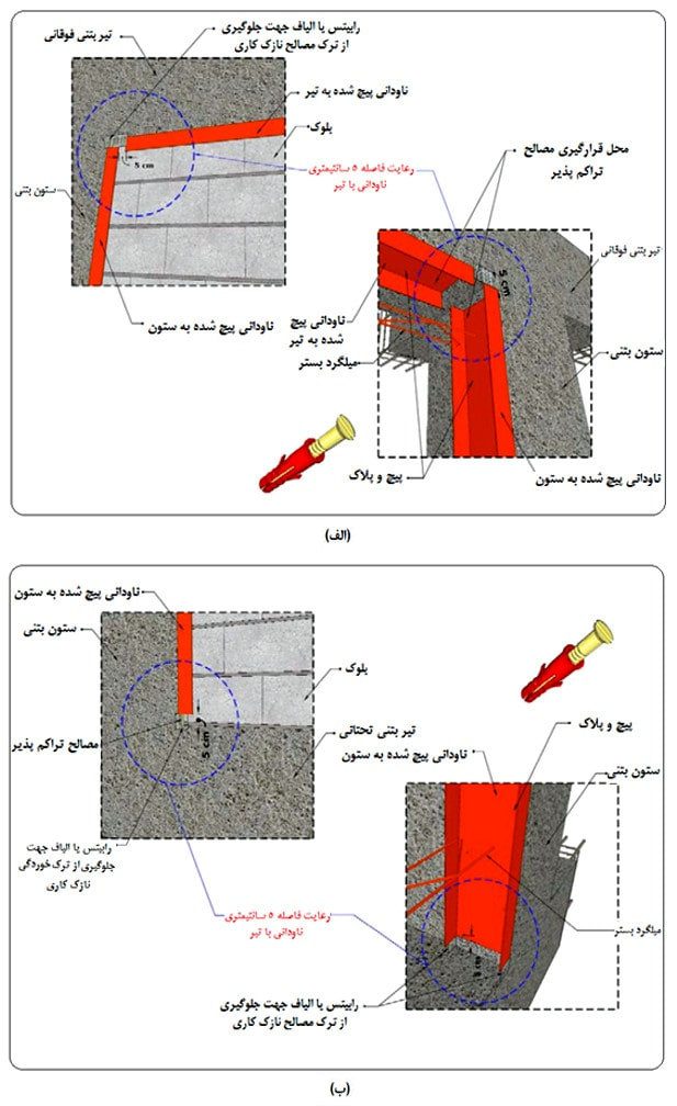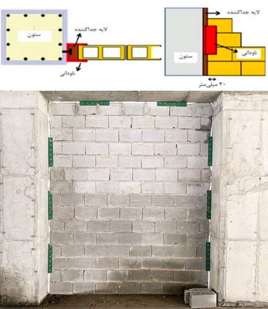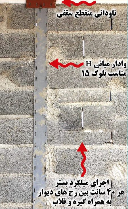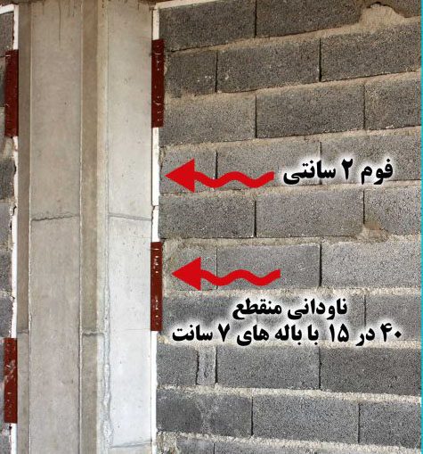 • برای قسمتهایی که دیوار با ستون زاویه دارد ، می توان بجای ناودانی های منقطع از گیره‌های لوبیایی استفاده کرد.