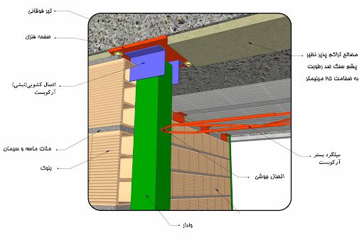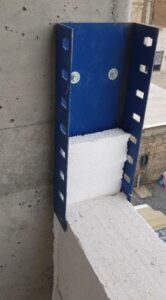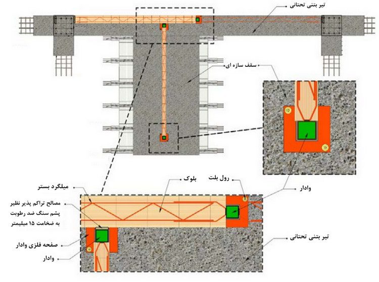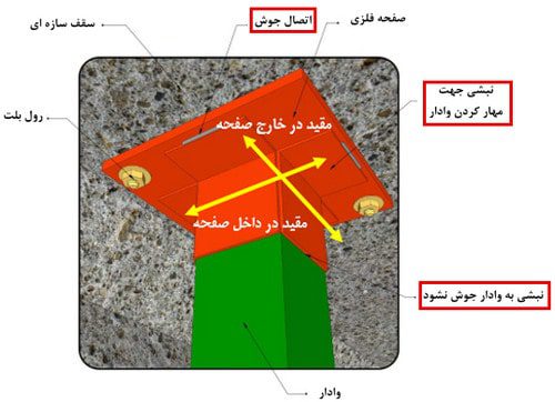• برای کنار ستونها هم اجرای گیره ، توسط جوش مستقیم روی ستون فلزی و جوش ، روی ورق رول بلت شده روی ستون بتنی ، برای مهار میلگرد بستر کافی است و دیگر نیازی به اجرای وال پست کناری یا منقطع روی ستون ها نیست.