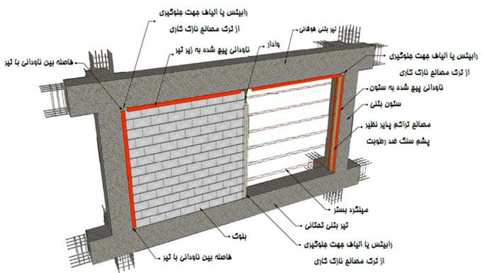 • طبق پیوست 6 استاندارد 2800، نمی توان دیوار را به ستون و تیرها و سقف مانند قدیم قفل کرد و باید فاصله ای به اندازه 3 سانتیمتر بین ستون با دیوار درون والپست و تیر یا سقف با آخرین رگ اجراشده دیوار درون وال پست ایجاد شود که این فاصله با پشم سنگ یا پلی استایرن پر خواهد شد.