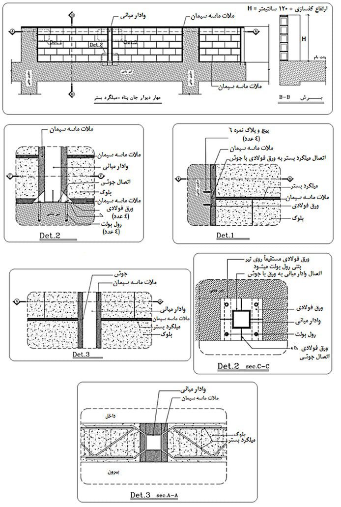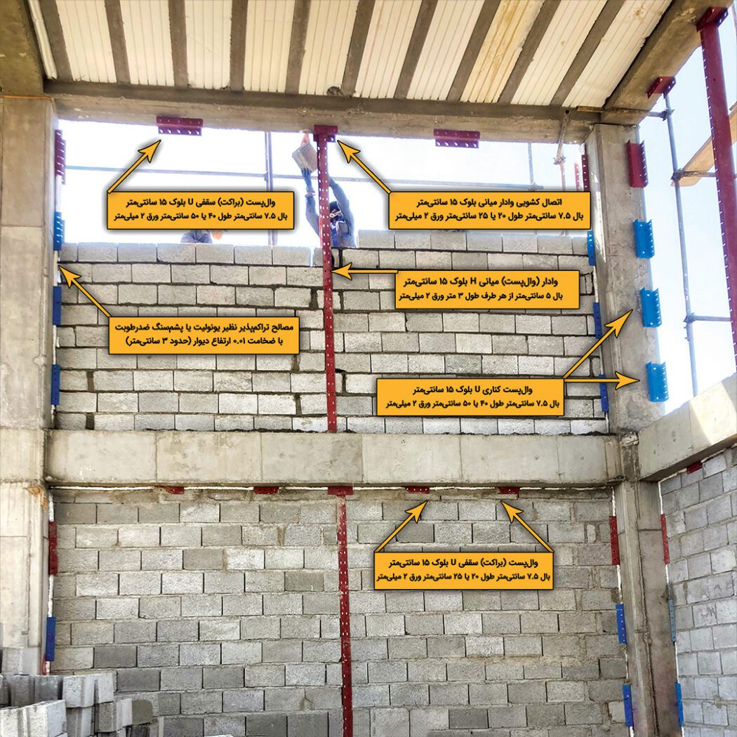 • در صورت استفاده از والپست بتنی به جای فلزی، اجرای دو میلگرد طولی با سنجاقک برای والپست ها کفایت می کند و هر یک متر باید درون دیوار اجرا گردد.