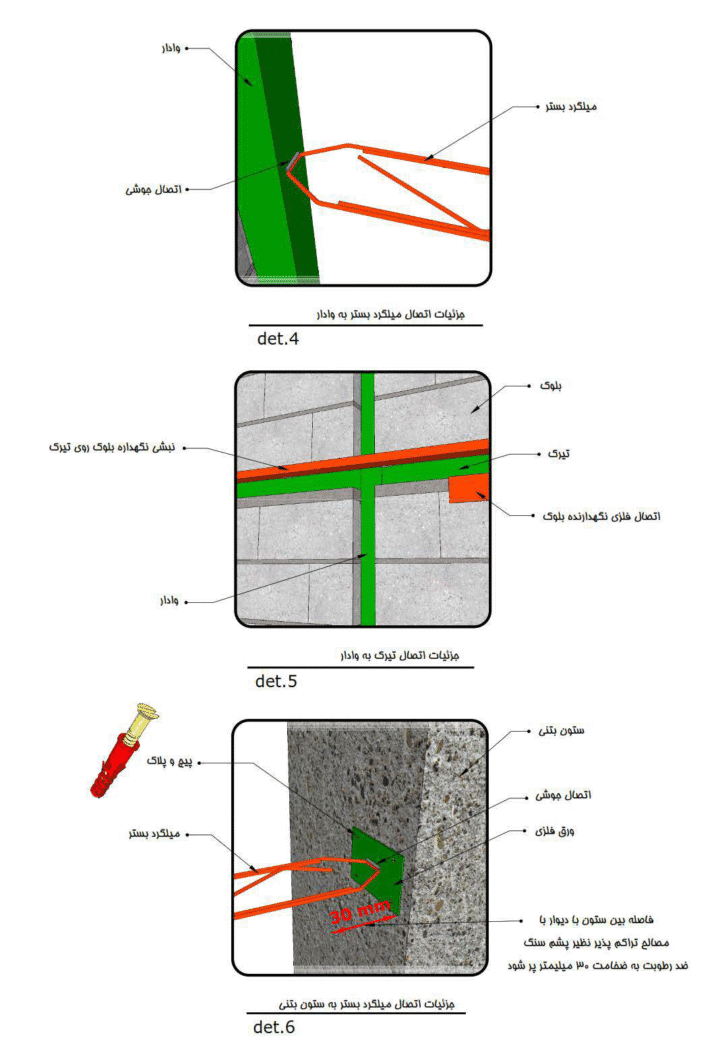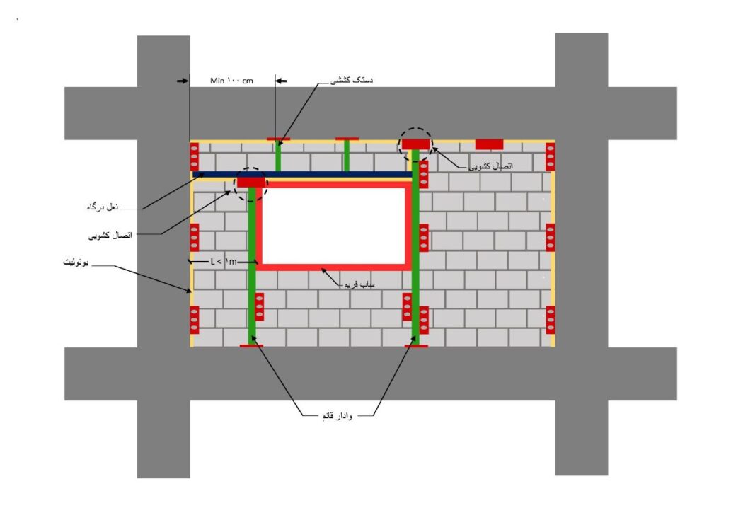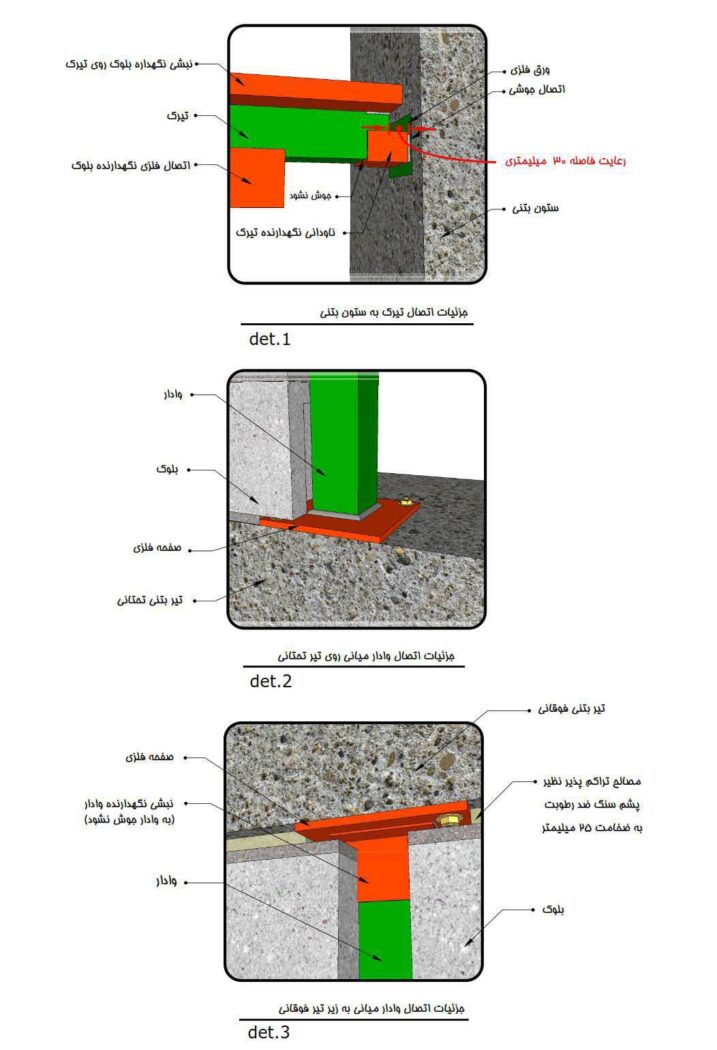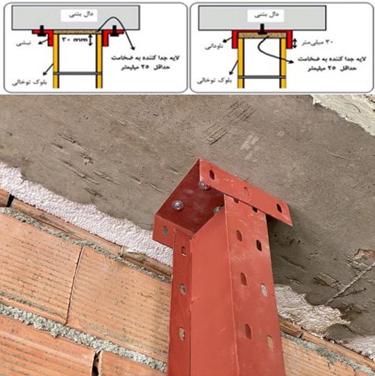 • طبق دستورالعمل‌های آیین‌نامه 2800 , برای مهار فوقانی والپست میانی و وال پست کنار بازشو به زیر سقف یا تیر باید از اتصال کشویی استفاده شود.