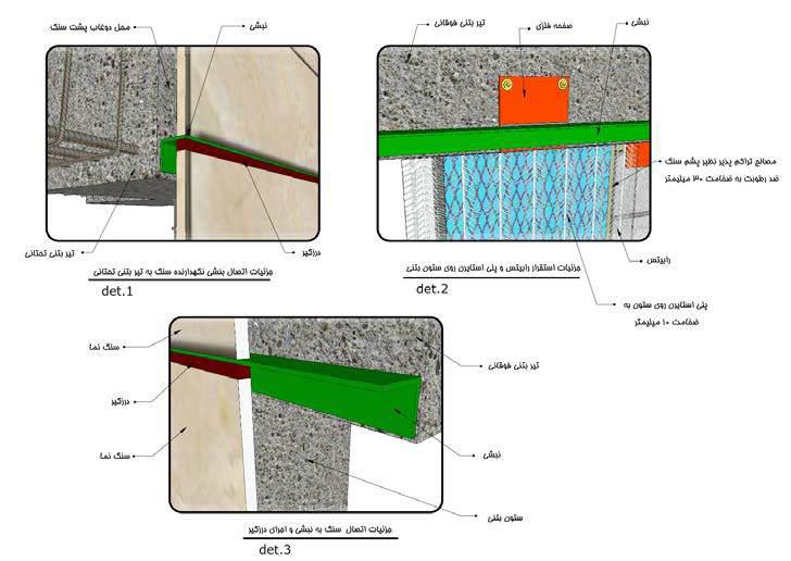 اجراي نما باید به گونه اي باشد که در تراز طبقات (تیر یا دال) در نما درز انقطاع اجرا شود. بدین منظور نبشی در زیر تیر طبقه اجرا می شود که از بالا مصالح نما (سنگ یا آجر) بصورت مستقیم بر روی نبشی قرار می گیرند و از پائین پشم سنگ یا پلی استایرن بین نبشی و سنگ زیرین آن جهت جداسازی قرار می گیرد.
