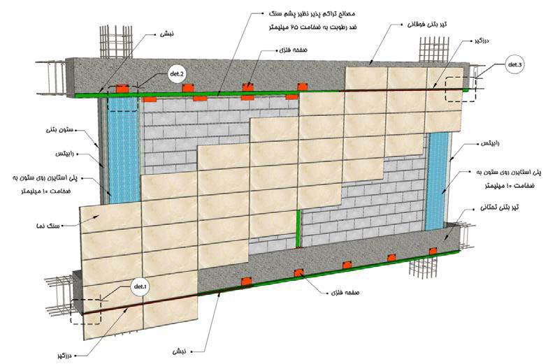 بطور کلی اتصال نما به دیوار باید به گونه ای باشد که ، امکان حرکت آن با دیوار فراهم شود و در محل هایی که پوشش نما از ستون ها عبور می کند باید توسط مصالح پرکننده نظیر پشم سنگ ، از چسبیدن نما به ستون ها جلوگیري شود.