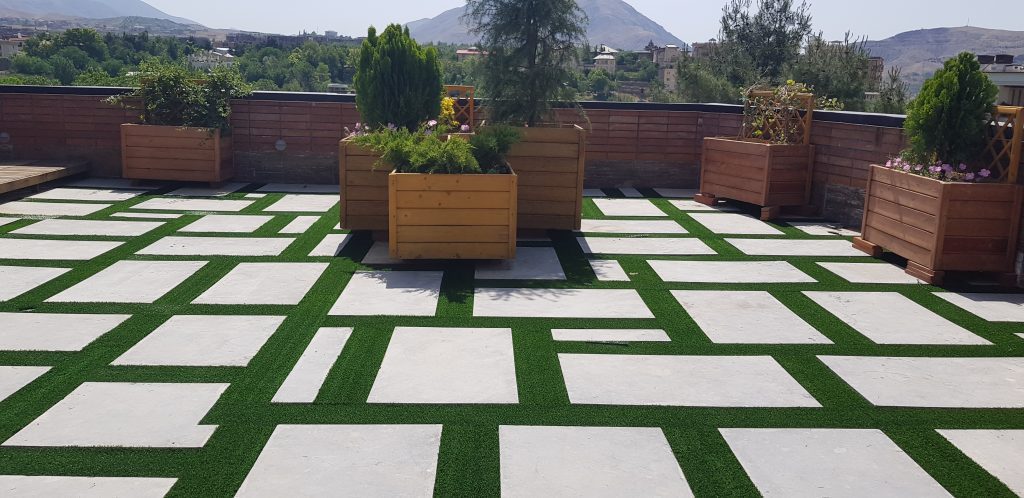 2 – با توجه به فضای کوچک حیاط و همینطور دید مناسب بام تصمیم گرفتیم تا روف گاردن اجرا شود.